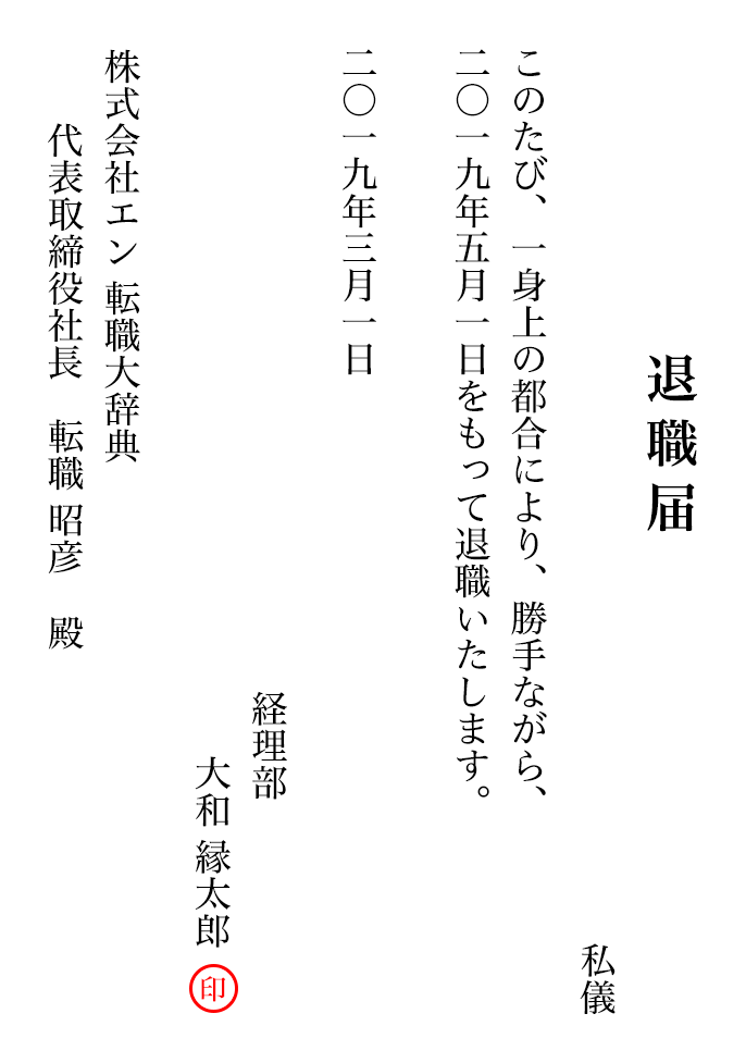 書面で伝える場合 「私の一身上の都合により、退職を希望いたします。適応障害の診断を受け、業務を継続することが困難であると判断しました。」